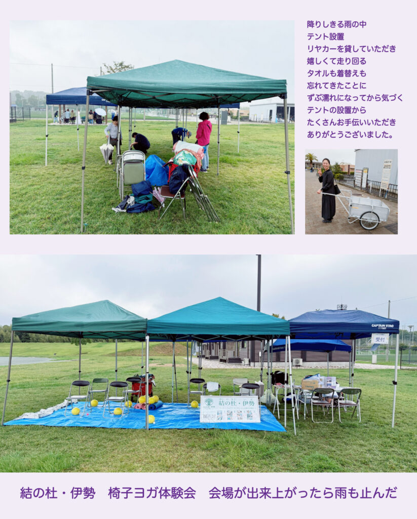 当日はあいにくの雨天となり、会場設営やテント準備など、厳しい環境の中での活動となりましたが、結の杜・伊勢のスタッフの皆さまがずぶ濡れになりながらも協力し合い、無事に会場を整えることができました。